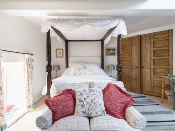 The dreamy bedroom, on the first floor, has a beautiful antique four-poster bed and views across the water. The good sized bathroom is on the second floor and has an extra bed at the dressing room end, curtained off. Ideal for a little one.