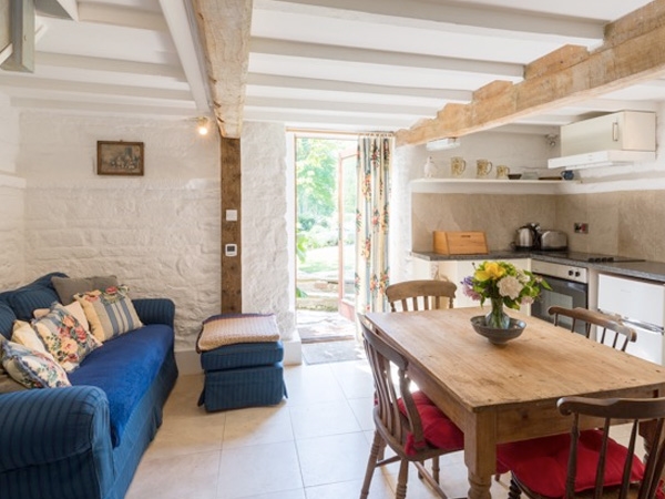 Park in front of the Manor then follow the path along the Mill stream. The door opens into a simple, stylish open plan lounge/kitchen with marble flooring, cosy under-floor heating and flame-effect stove.