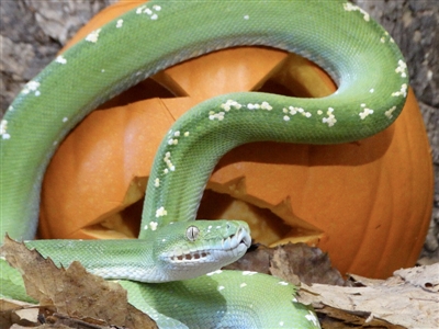 Animals treated to special pumpkin enrichments (pumpkins filled with their favourite treats) include: Zorro (Giant Anteater male), Dobby the Binturong, Tapirs Gomez and Lolly, Wolverines (who were treated to a honey-covered pumpkin - they adore honey). Wolverines posses one of the most powerful bites per square inch of any mammal. To keep with the spooky theme, I've included a Green Tree Python (its bright green colouring looks striking on the orange pumpkin) and the first Mossy Frog bred at the Park (and a favourite with the Reptile team), bobbly Bob.