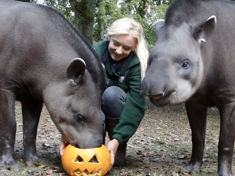 Chris Kibbey, Section Head of Primates and Small Mammals, said: “As well as ghosts, ghouls and witches, the end of October also signifies an abundance of pumpkins! These make great enrichment items for our animals and allows the keepers to be a bit creative too. This year, our Dwarf Mongoose family experienced them for the first time, and the young triplets enjoyed putting their arms through the eye holes to get at the treats inside. The pumpkin offered to the Wolverine didn’t last long as they destroyed theirs to get at the contents. The Giant Tortoises, Tapirs and Giant Anteaters also got into the Halloween spirit with their very own pumpkin treats too.”