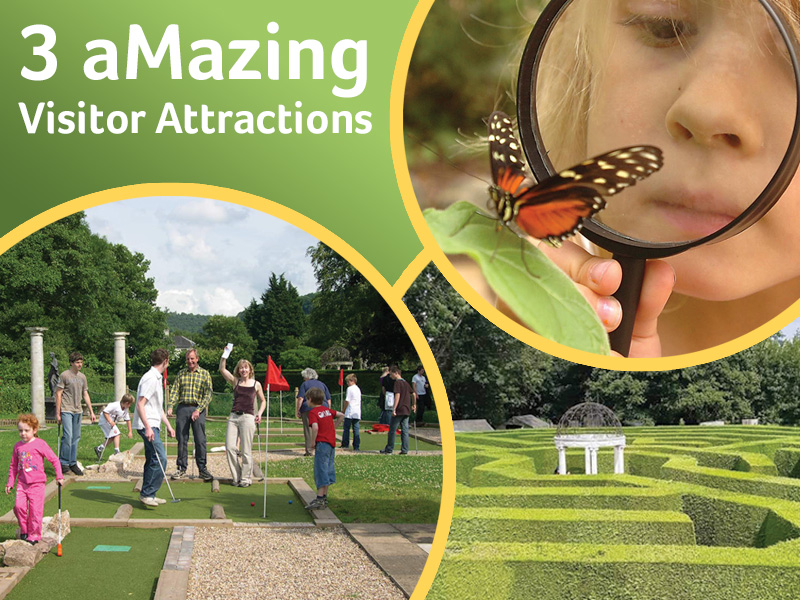 Enjoy a day out at this top visitor destination at Symonds Yat West in the Wye Valley, Forest of Dean with three completely different attractions; the aMazing Hedge Puzzle, Miniature Golf and Butterfly Zoo.