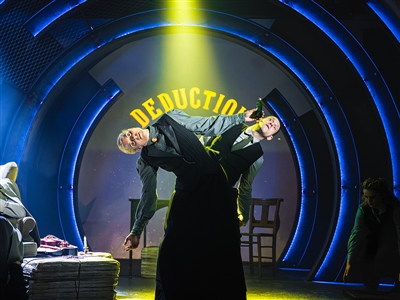 Running gags and ‘meta gags’ abound. The exceptional qualities of Mrs Hudson’s narratively significant marmalade are regularly extolled. Authors interact with their own creations, and there are intrusions from other fictional universes. In one particularly funny sequence, a cavalcade of Dickens characters (played in super-quick succession by the versatile Chloe Tannenbaum) accost Holmes and Mrs Hudson as they walk, run and cycle through the streets of London. A dog with a string of sausages – an escapee from the Beano? – provides a smile-inducing call-back.