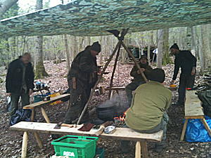 Whilst us bushcraft students prepared the finishing touches to our nights dwelling, a hearty chicken casserole was being cooked in one huge pot. It tasted as good as it smelt and after we all chatted and joked around the campfire. I thought it was a good time to inform my fellow campers that I was sometimes prone to snoring. “Be it at your peril, as the local wild boar may think it’s a mating call”, retorted the instructors. That night, although warm and comfy, I slept with one eye open and my mouth firmly shut!