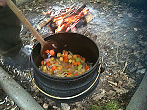 Whilst us bushcraft students prepared the finishing touches to our nights dwelling, a hearty chicken casserole was being cooked in one huge pot. It tasted as good as it smelt and after we all chatted and joked around the campfire. I thought it was a good time to inform my fellow campers that I was sometimes prone to snoring. “Be it at your peril, as the local wild boar may think it’s a mating call”, retorted the instructors. That night, although warm and comfy, I slept with one eye open and my mouth firmly shut!